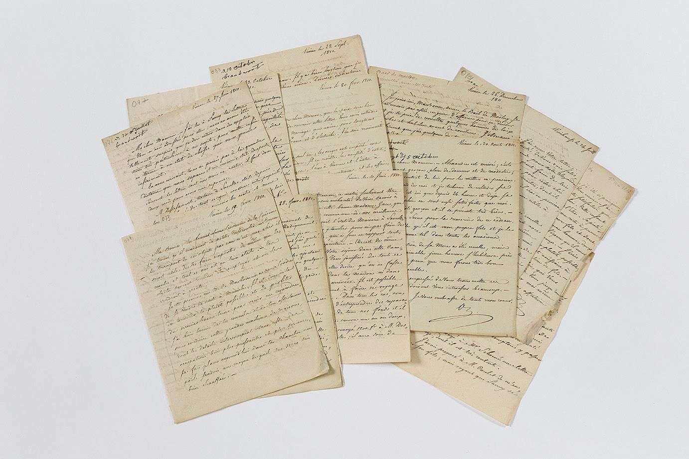 1810. - 19 février (à sa femme). M. de Narbonne va le remplacer à Munich. Il parle des dispositions des Viennois: « La joie est universelle ici, les gens de tous les partis boivent à la santé de Napoléon, [...] l'Ambassadeur est considéré comme un ange de paix »... - 20 février. Il espère « que la paix sera bien durable », car sa mère aura appris le « grand mariage qui unira pour longtems les Empires de France et d'Autriche ». Les neiges ont empêché sa famille de le rejoindre... - 25 février (à sa femme). Description de MARIE-LOUISE: « Notre future Impératrice est pleine de talens, grande musicienne et peintre à l'huile. Elle parle 3 ou 4 langues, a infiniment de douceur et de bonté, une belle taille et de la grace »... - 3 avril. Récit de la brillante fête qu'il a donnée: « tous les archiducs et 400 personnes du premier rang y ont assisté »... - 10 juin. Sur ses propriétés de Sarcelles, sa femme et sa fille Sophie... - 27 juin, sur leurs affaires et Sarcelles. - 23 septembre.