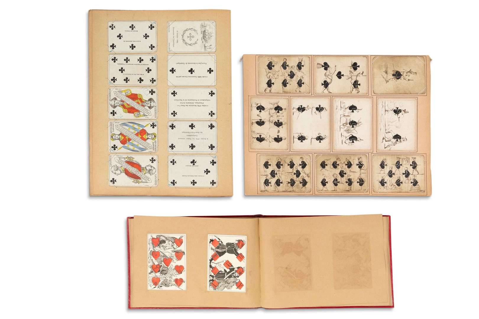 ENSEMBLE DE CARTES À JOUER - 1815. Jeu de cartes comiques ou de transformation dit « Jeu du Colonel Athalin », par Louis-Marie-Jean-Baptiste Athalin, eau-forte sur acier et couleurs au pinceau. Jeu complet 52 cartes, rare, tirage à 50 exemplaires dont certaines de ces cartes sont conservées à la Bibliothèque Nationale de France.