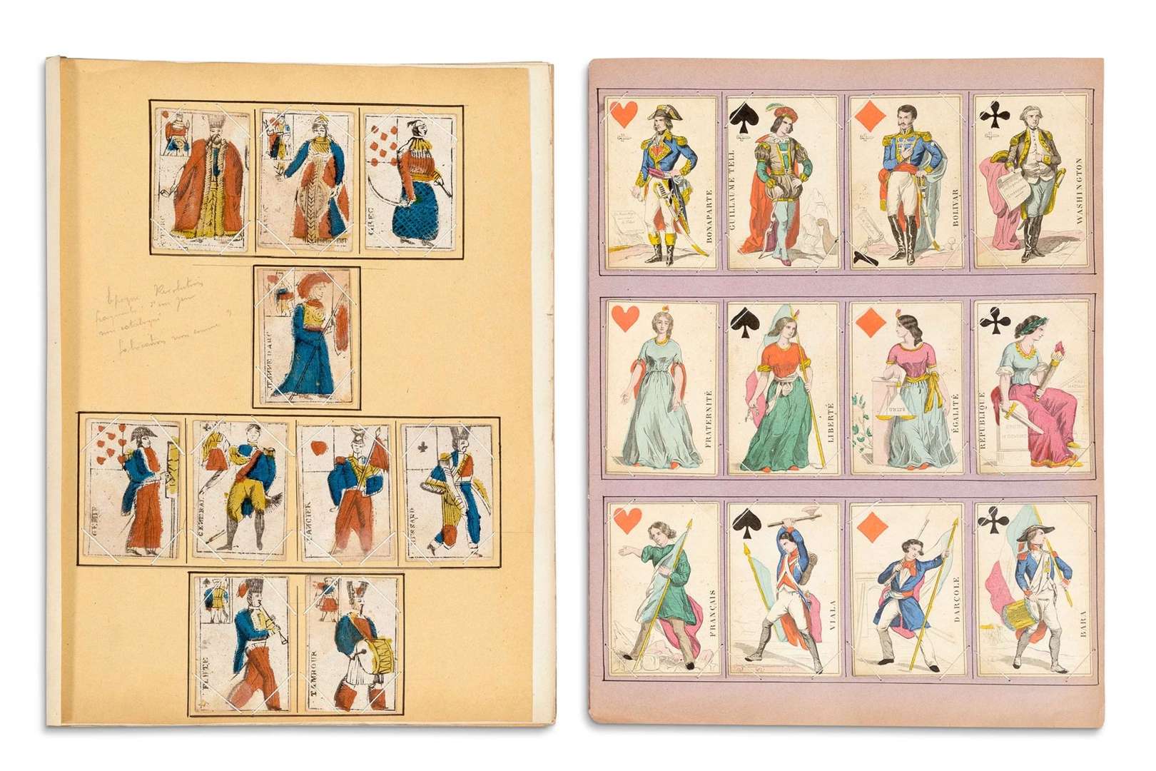 ENSEMBLE DE CARTES À JOUER - Fin XVIIIe. Fragments d'un jeu non catalogué de l'époque de la Révolution Francaise composé de 10 cartes originales (style artistique, sujet, taille réduite).
