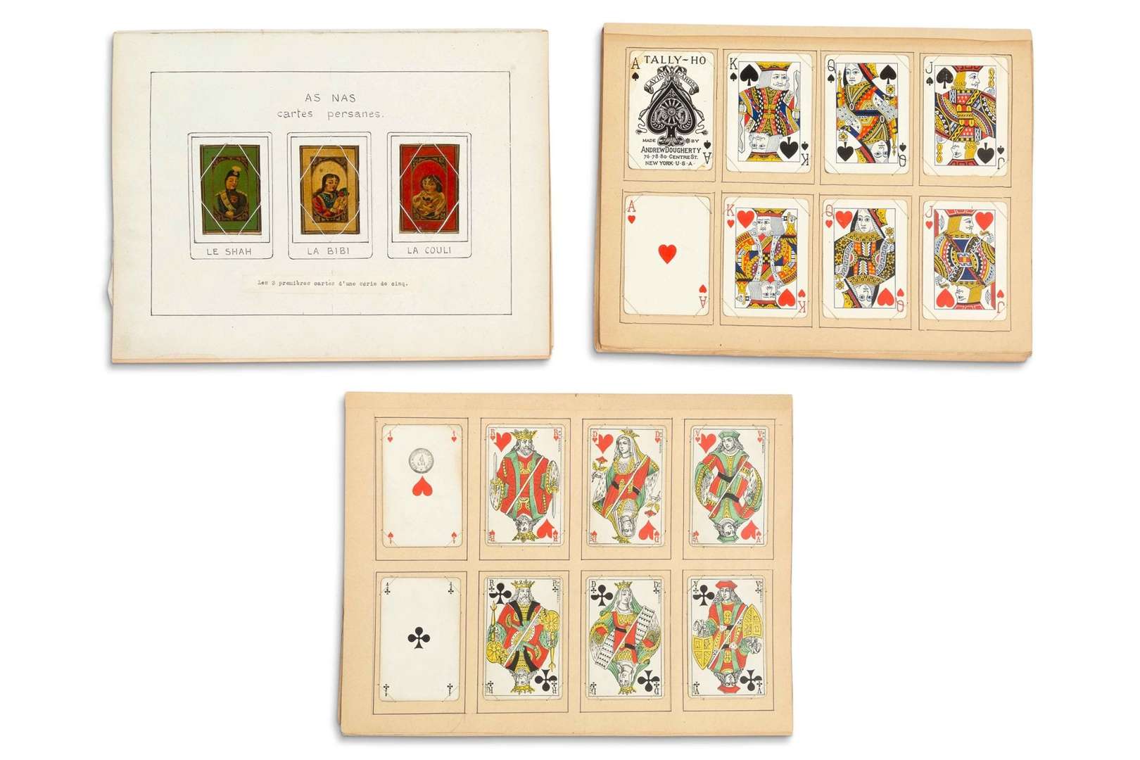 - Milieu du XIXe siècle. Jeu persan de 3 cartes d'une série de « AS NAS », on y retrouve le Shah, la Bibi et la Couli (manquent le lion et le Sarbas). Les cartes sont peintes à la main et recouvertes d'un vernis à la gomme laque