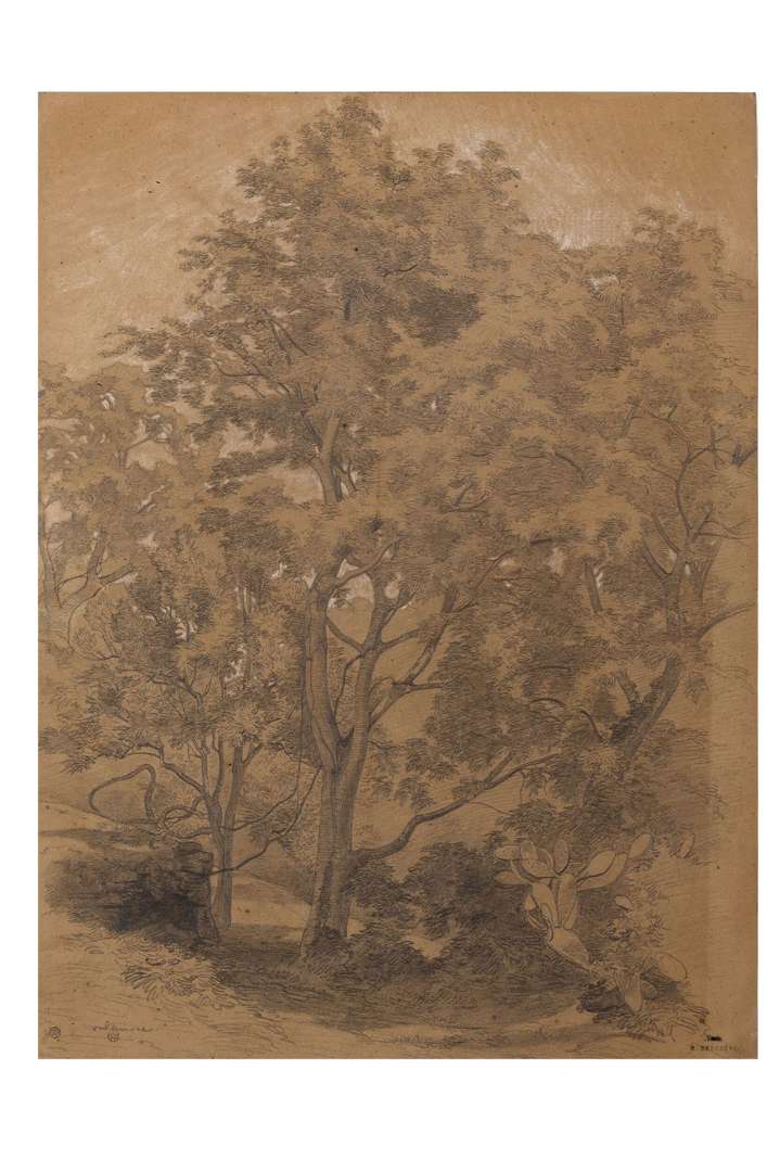 Graphite and white chalk on chamois paper, stamped with the 'Vente/N. Berchère' mark lower right, located and stamped 'Collection Marie-Madeleine Aubrun' mark lower left, inscribed 'voyage de Berchère aux Baléares/ et en Espagne en 1847/exposition en 1848' on the reverse