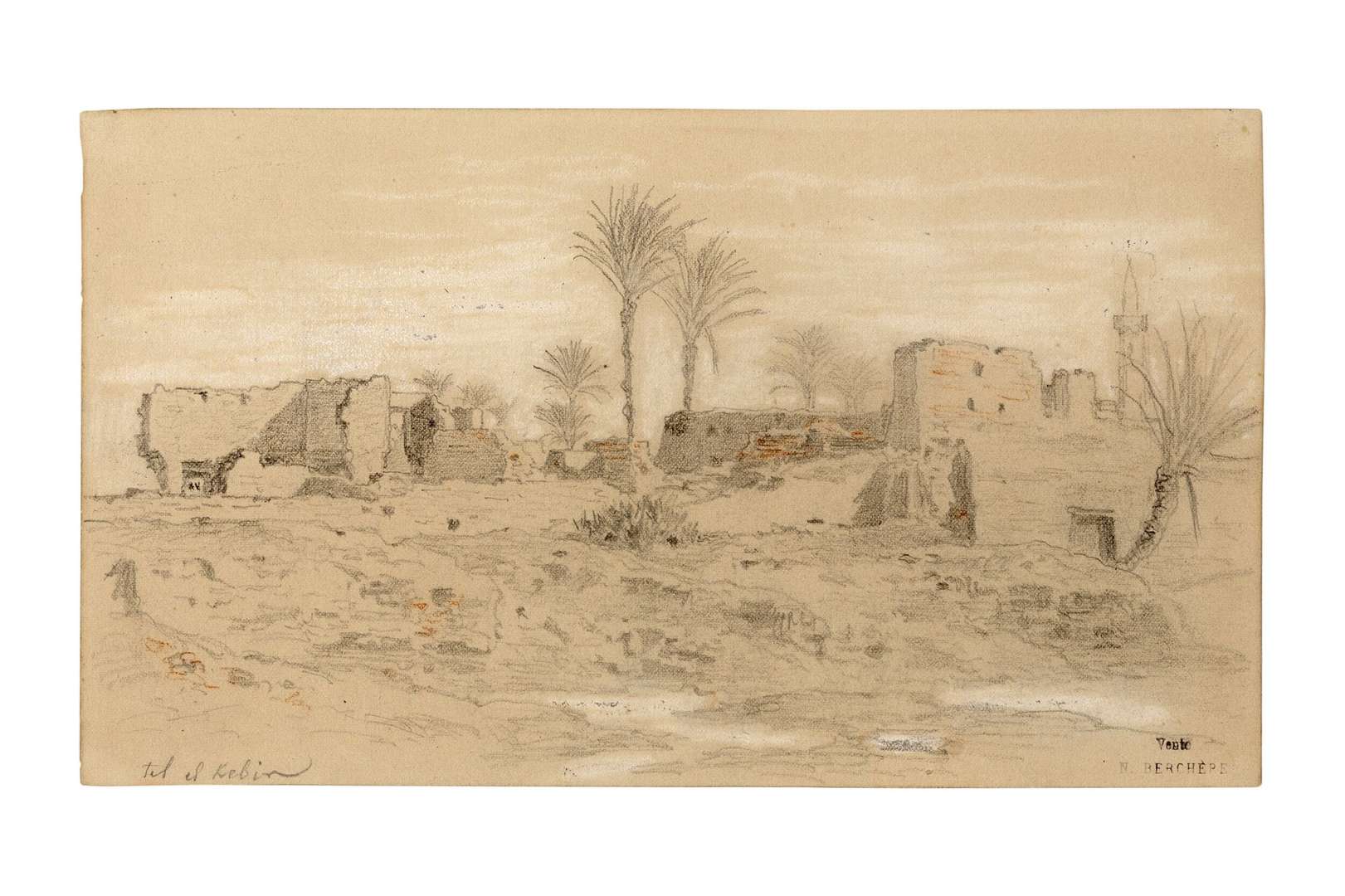 Graphite, white and red chalk on toned paper, stamped with the 'Vente N. Berchère' mark lower right, located lower left, a sketch of palm trees on the reverse