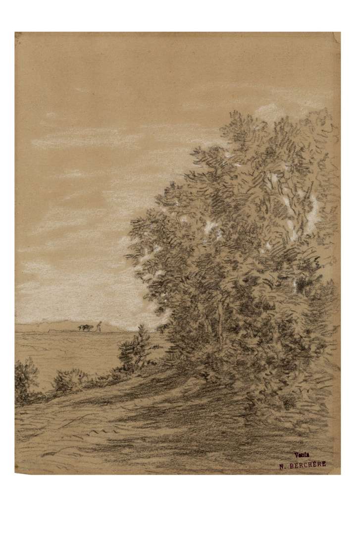 Black and white chalk on paper, stamped with the 'Vente/N. Berchère' mark lower right, a sketch of riverbanks on the reverse