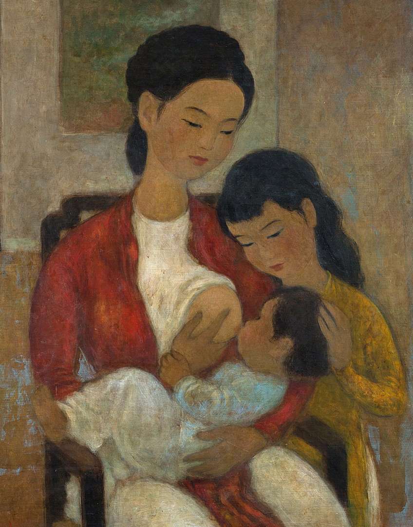 The painter thus renews the universal subject of motherhood that is so dear to him by adding the figure of the sister and depicting the moment of breast-feeding. Indeed, this is a moment very rarely depicted in Asia. Vũ Cao Đàm probably