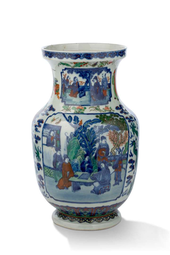 = Important vase en porcelaine bleu-blanc et surdécor aux émaux polychromes, la panse décorée de deux réserves peuplées d'immortels taoïstes alternant avec des dragons impériaux pourchassant la perle.
