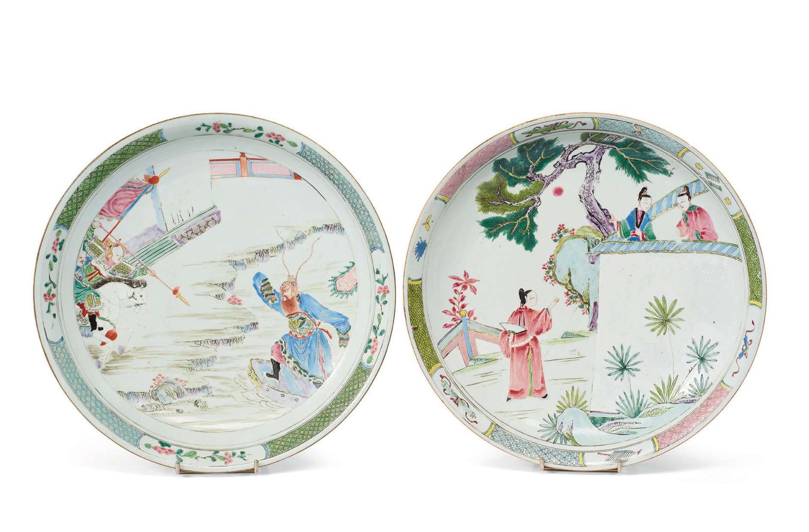 Un grand plat en porcelaine de la famille rose décoré d'un couple se faisant la cour.