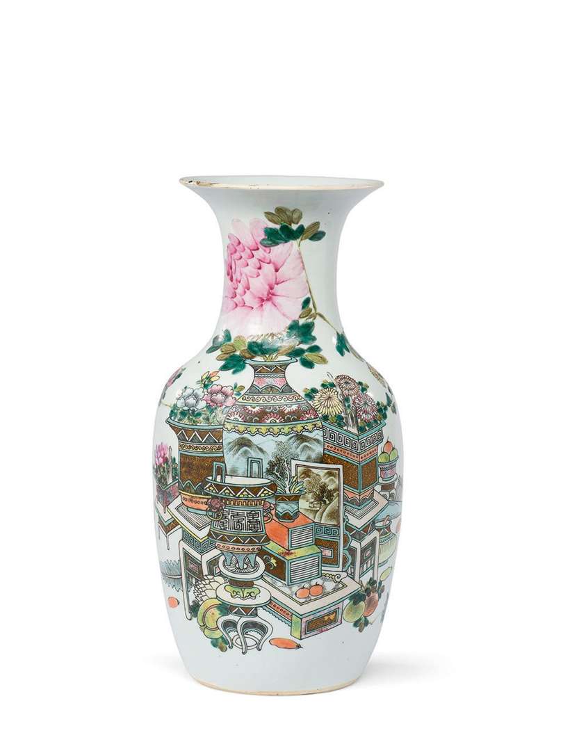 De forme balustre, la panse décorée sur une face des «Cent Antiques» et de branches fleuries, le revers avec une inscription calligraphiée. Signé Dai Huanzhao et avec une date cyclique «yisi» (1905).