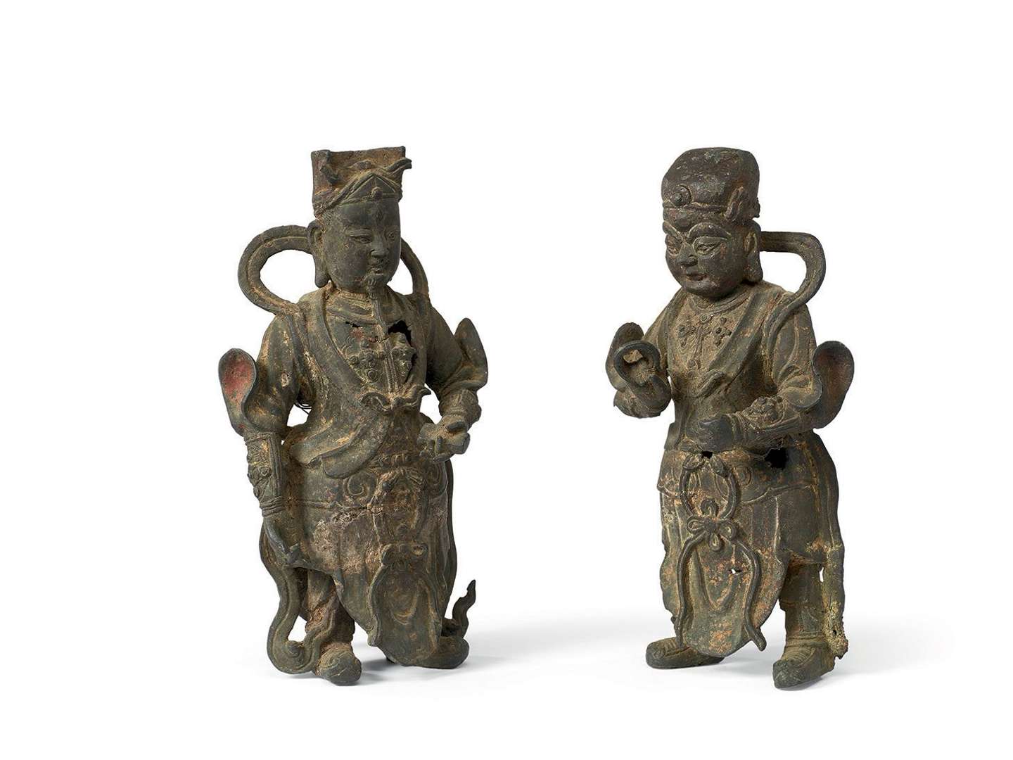 Paire de statuettes de gardiens en bronze