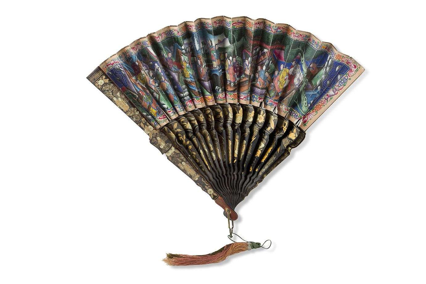 Les brins laqué noir et décoré à l'or de personnages dans un jardin, la feuille à décor double face de dignitaires et dames de cour dans des palais et jardins, les visages minutieusement peints et les vêtements avec des applications de tissu. Pampilles en fils de soie tricolores. Dans sa boîte en laque noir et or.
