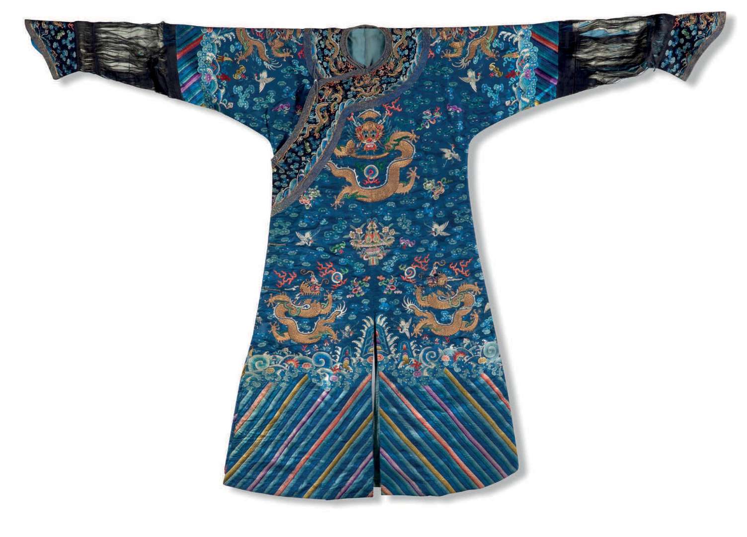 Robe de cour d'homme (longpao) en soie bleue brodée aux fils polychromes et d'or de neuf dragons à cinq griffes pourchassant la perle parmi des nuages peuplés de chauvesouris, grues et paniers fleuris, audessus d'une bande de lishui surmontée de flots tumulteux d'où émergent les pics sacrés et des objets précieux. Doublée de soie bleu pâle.