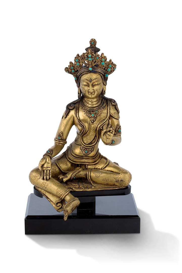 = Statue en alliage cuivreux doré et inscrustations de pierres dures figurant