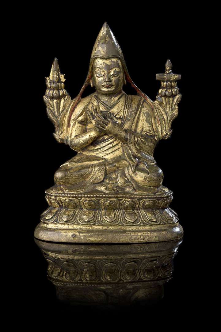 Petite statuette en alliage cuivreux doré figurant Tsongkhapa assis en vajrasana sur une double base lotiforme, les mains en dharmachakra mudra devant le torse, deux tiges florales s'épanouissant sur les épaules et supportant ses attributs, l'épée et le livre.
