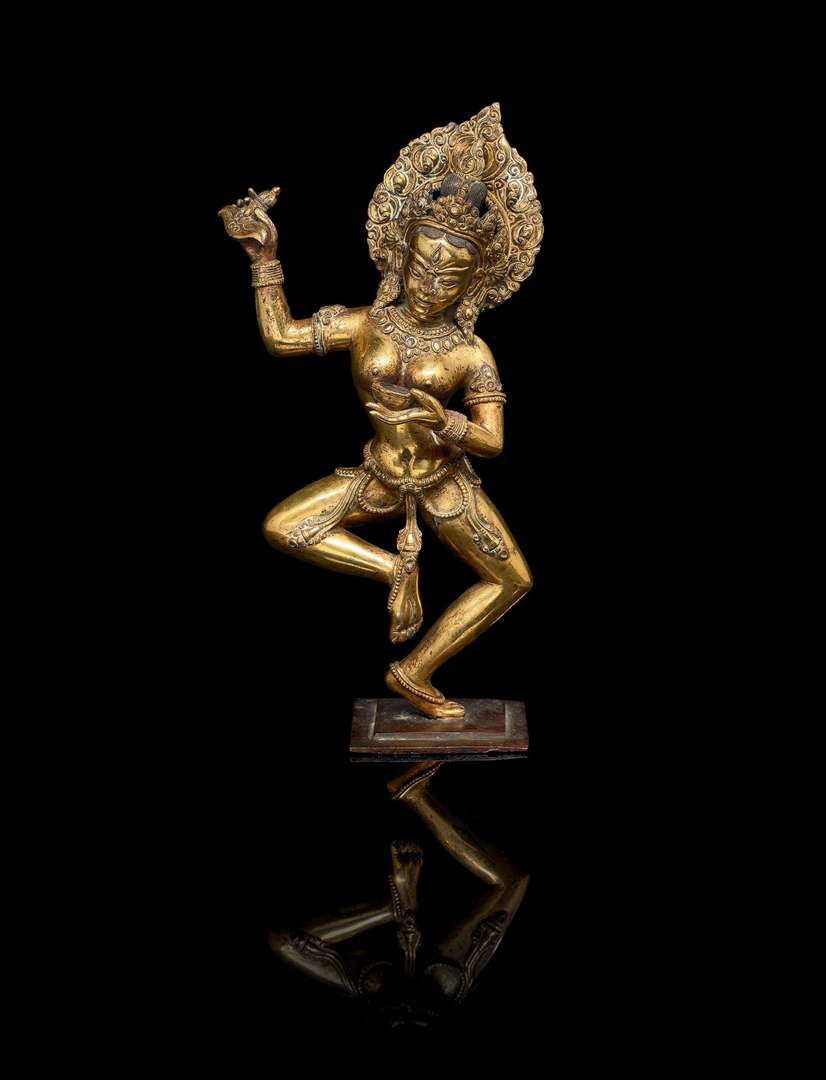 La yidam debout en ardhaparyankasana, une main brandissant un kartika, l'autre tenant un kapala, parée de bijoux, la tête soulignée par un nimbe flammé stylisé. Avec un socle métallique postérieur.