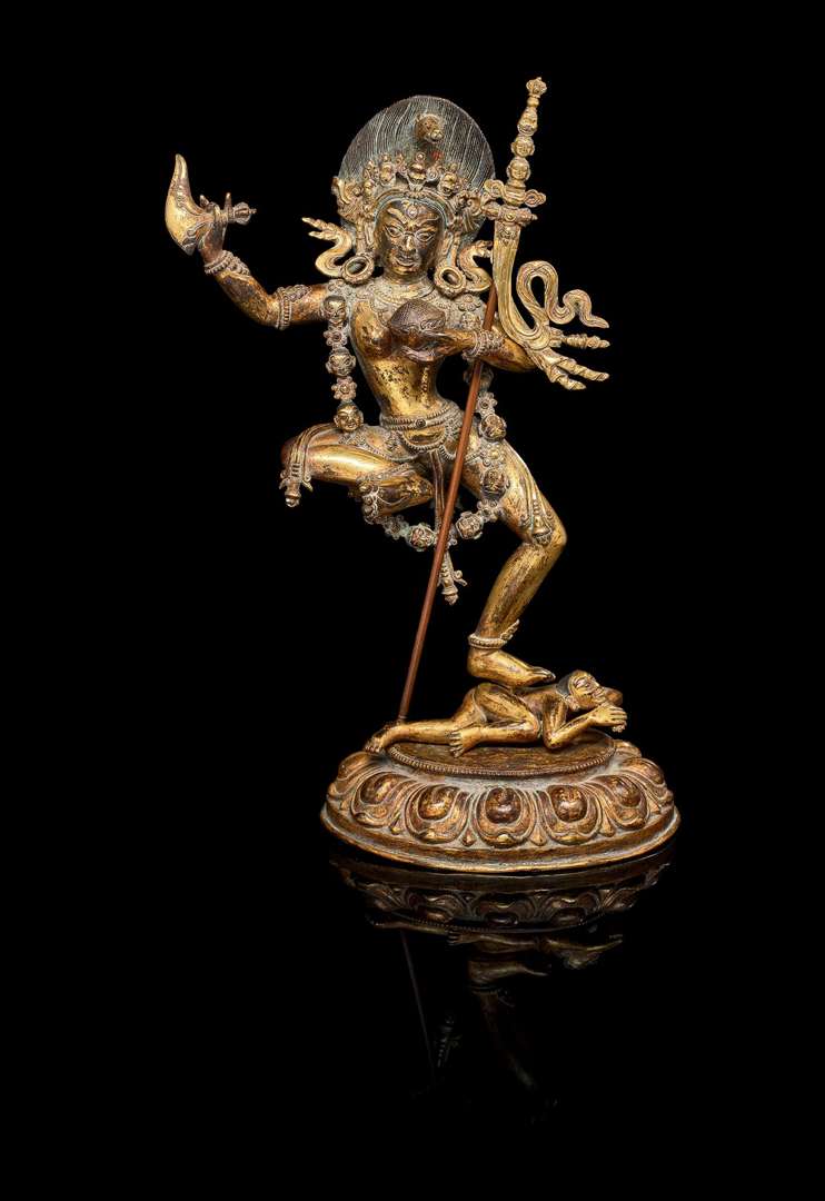 La yidam debout en ardhaparyankasana piétinant un corps sur une base lotiforme, une main brandissant un kartika, l'autre tenant un kapala et un khatvanga, parée de bijoux, la chevelure hirsute abritant une petite tête de laie. La base scellée.