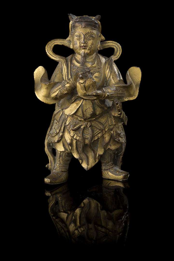 Vêtu d'une cuirasse et d'un vêtement aux manches flottantes, chaussé de bottes et tenant à deux mains une boîte d'offrandes.