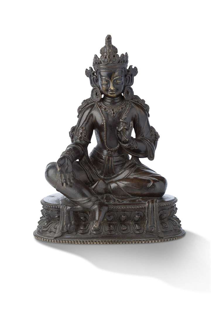 La bodhisattva assise en lalitasana sur une double base lotiforme, son pied droit reposant sur une fleur de lotus, la main droite en varada mudra et la main gauche en mudra du refuge, vêtu d'un dhoti et d'écharpes flottantes, parée de nombreux bijoux.La base non scellée.