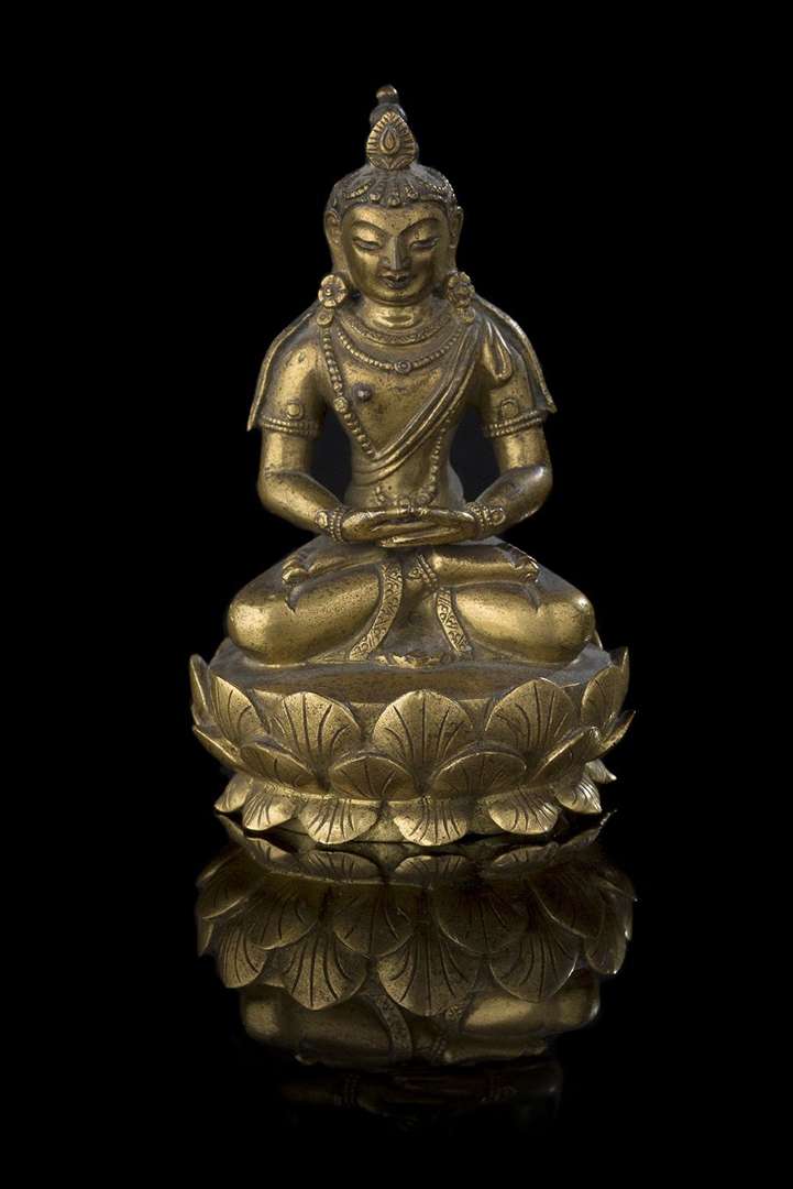 Le bouddha assis en jajrasana sur une double base lotiforme, les mains en dhyana mudra, vêtu d'un fin dhoti et paré de bijoux. La base non scellée.