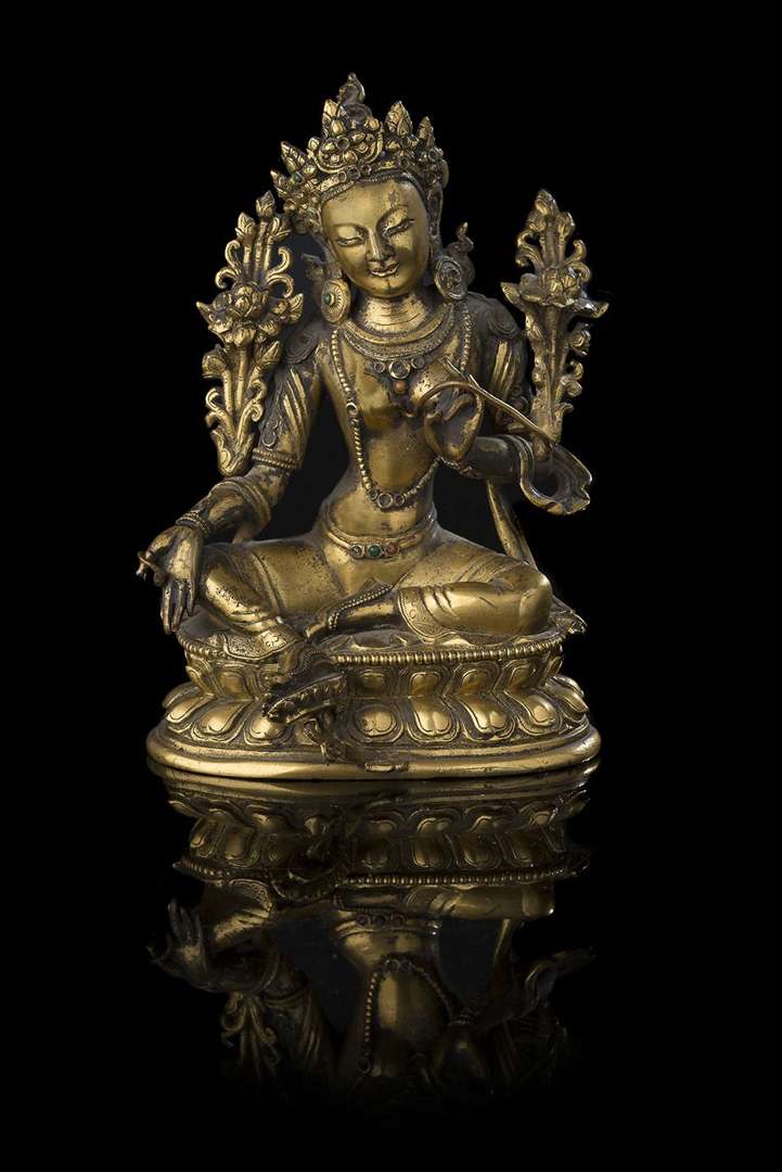 La divinité assise en lalitasana sur une double base lotiforme, son pied droit reposant sur une fleur de lotus, la main droite en varada mudra et la main gauche en mudra du refuge, avec deux tiges de lotus s'épanouissant sur les épaules. La base scellée gravée de deux vajra.