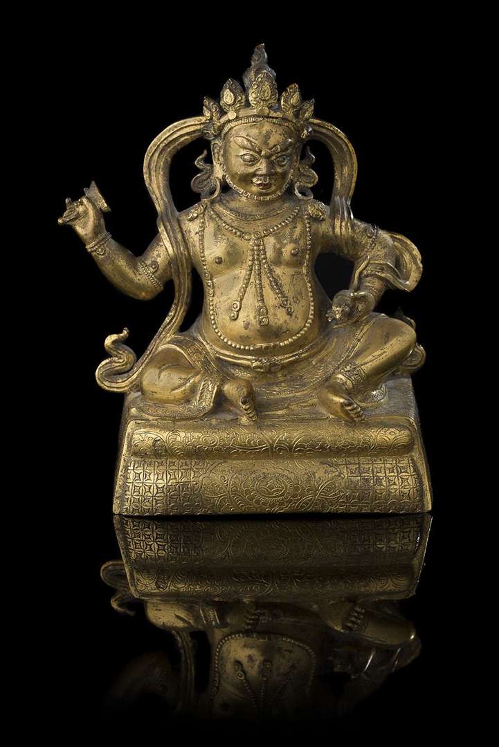 La divinité représentée assise en lalitasana sur une base quadrangulaire ciselée de rinceaux, tenant une épée et une mangouste dans les mains, vêtu d'un fin dhoti et paré de bijoux.