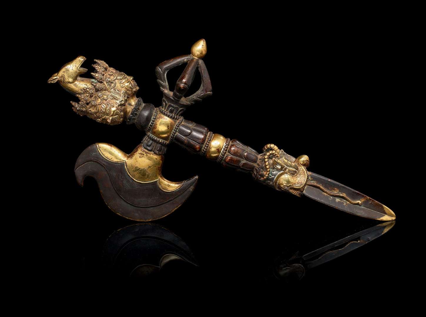Le sommet de la dague avec les trois visages d'Hayagriva surmontés d'une tête de cheval, la lame trangulaire jaillissant d'une gueule de makara.