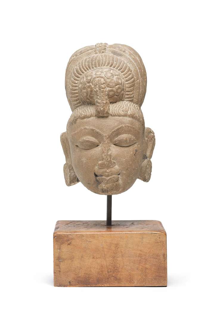 La chevelure coiffée en un haut chignon aux mèches détaillées et paré d'ornements, le visage rond aux yeux en amandes encadré par d'imposantes boucles d'oreille circulaires.