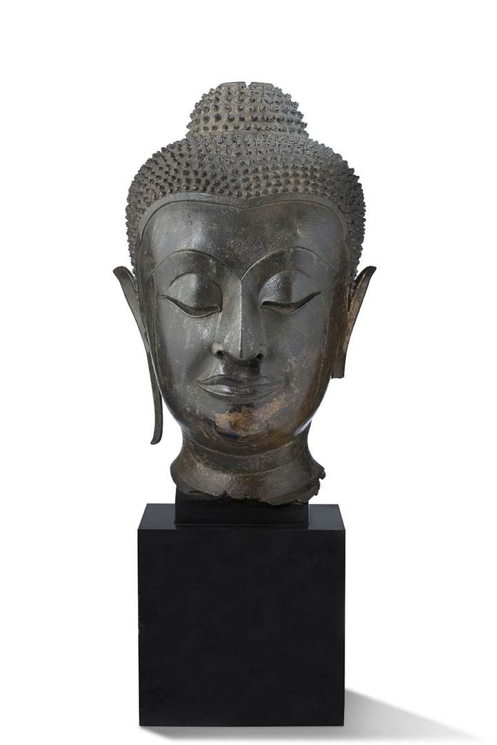 En alliage cuivreux à patine brune, le visage aux traits délicats encadré par des oreilles légèrement pointues aux lobes allongés, les sourcils arqués, la chevelure traitée en petits picots serrés, la bouche esquissant un léger sourire. Avec son socle en pierre postérieur.