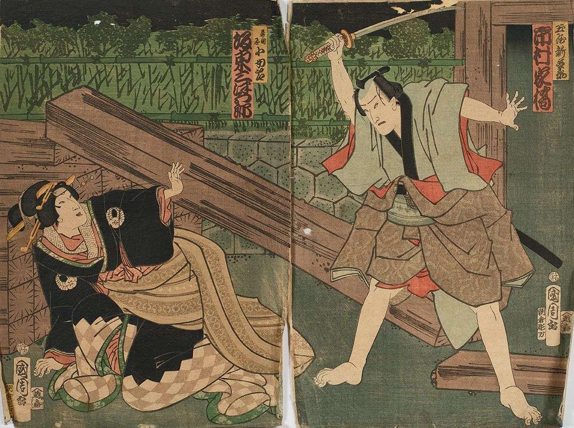 Format oban tate figurant des scènes de théâtre kabuki et des scènes historiques par TOYOHARA Kunichika, TOYOKUNI III et divers.