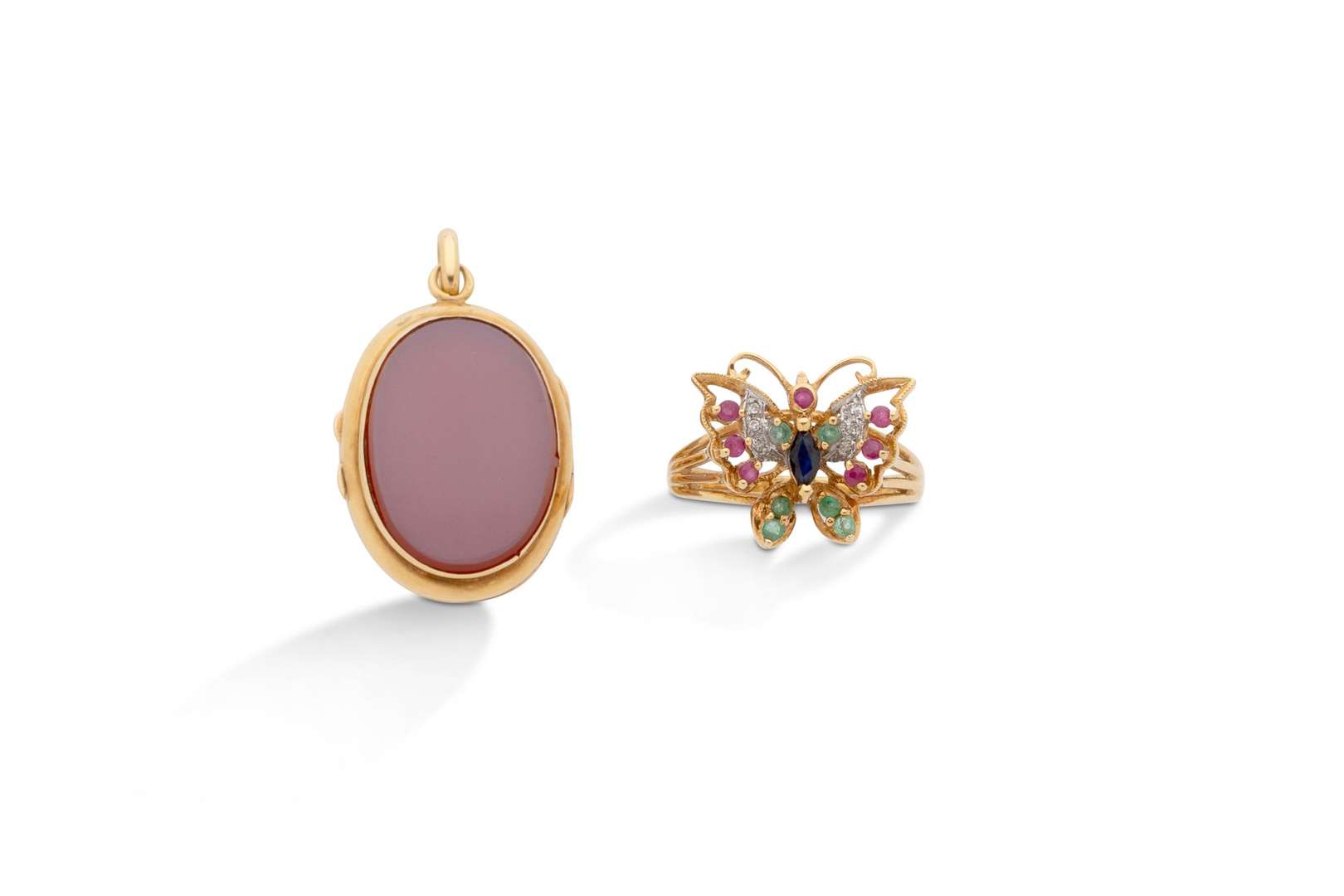- Bague "Papillon", émeraude, saphir, rubis et diamants taille rose, or 18k (750)