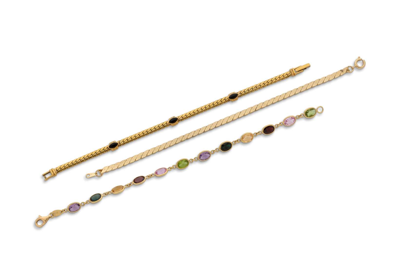 On y joint deux bracelets en métal. L. : 20 et 18 cm env.