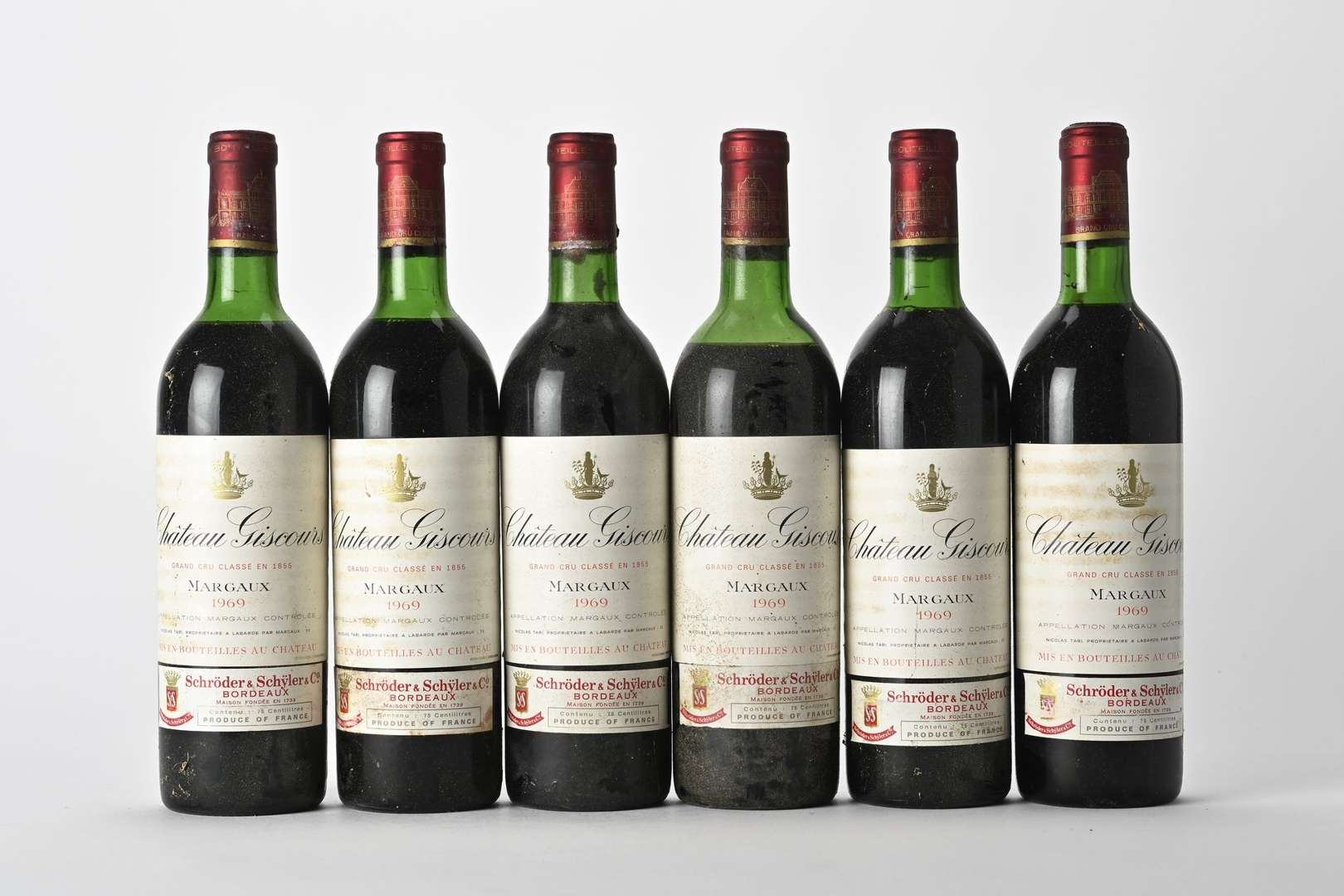6 B CHATEAU GISCOURS (1 B.G| 2 T.L.B| 2 H.E.+ et 1 M.E| e.t.h. avec bandeau négoce Schroeder & Schyler| c.s.) - 1969 - GCC3 Margaux