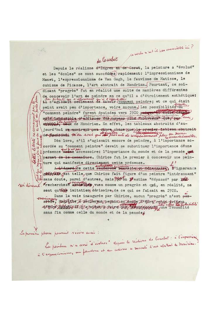 Très intéressant texte sur la peinture, abondamment corrigé. «Depuis le réalisme de COURBET, la peinture a “évolué” et les “écoles” se sont succédées rapidement : l'impressionnisme de MONET, l'expressionisme de VAN GOGH, le fauvisme de MATISSE, le cubisme de PICASSO, l'art abstrait de MONDRIAN». En bas de page, Magritte a ajouté au crayon rouge : «La première phrase pourrait s'écrire ainsi : La Peinture n'a cessé d'évoluer depuis le réalisme de Courbet : à l'impressionnisme, à l'expressionisme, au fauvisme et au cubisme a succédé l'art abstrait de Mondrian»... Le texte dactylographié continue, émaillé de biffures, de remplacements et d'ajouts : «Pourtant, ce soi-disant “progrès” fut en réalité une suite de manières différentes de concevoir l'art de peindre en ce qu'il a d'étroitement esthétique : la liberté ne s'affirmait qu'à l'égard du comment peindre | et ce qui était peint avait peu d'importance, voire aucune. Cette liberté ne concernait pas le réel lui-même. Or il faut la liberté du poète pour que le réel soit en cause»... Etc.