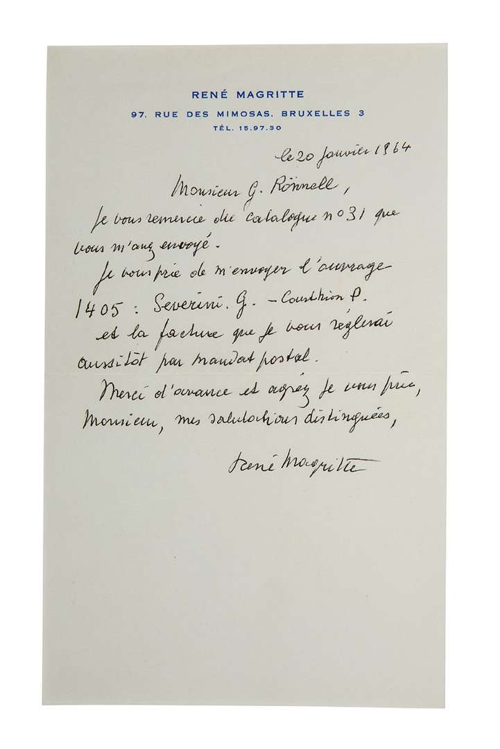 L.A.S. «René Magritte», Bruxelles 20 janvier 1964, à G. RÖNNELL | demi-page in-8 à son en-tête.