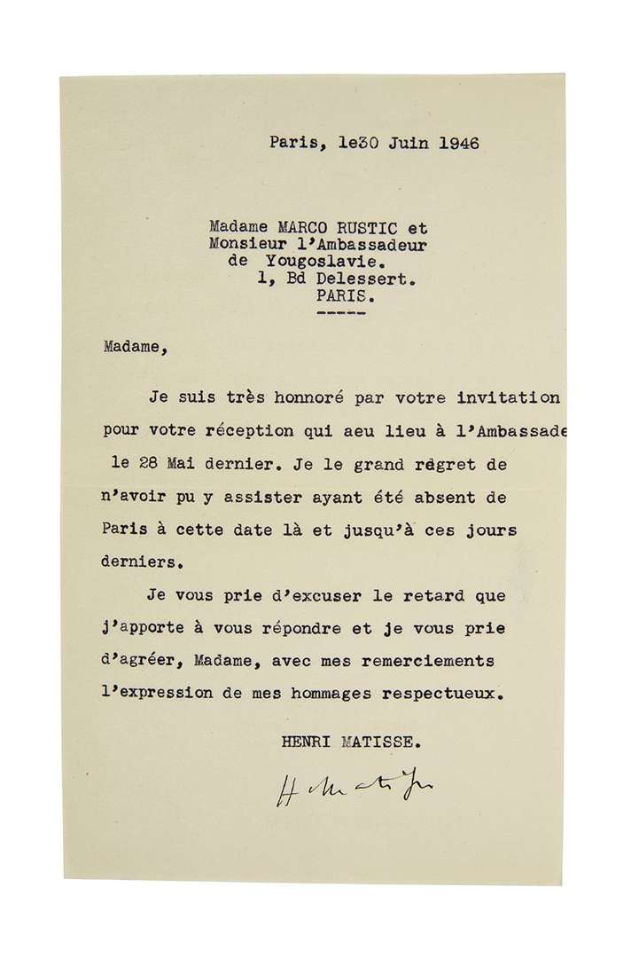 L.S. «H. Matisse», Paris 30 juin 1946, à Mme Marco Rustic, à l'Ambassade de Yougoslavie | 1 page in-4 dactyl., enveloppe.