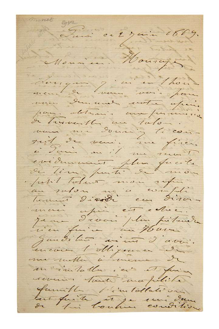 Belle et émouvante lettre sur ses débuts difficiles. [Arsène HOUSSAYE fut l'un des premiers acheteurs des toiles de Monet, notamment La Femme à la robe verte. Louis GAUDIBERT, riche négociant du Havre, soutint financièrement les débuts de Monet, en lui permettant de s'installer à Bougival.] «Lorsque j'ai eu l'honneur de vous voir pour vous demander votre apui pour obtenir une permission de travailler au Salon, vous me donniez le conseil de venir me fixer à Paris où il me serait évidemment plus facile de tirer parti de mon petit talent. Mon refus au Salon m'a complètement décidé car désormais après cet échec, je ne devais plus prétendre rien faire au Hâvre. Gaudibert vient d'avoir encore l'obligeance de me mettre à même de m'installer ici et faire revenir toute ma petite famille. L'installation est faite et je suis dans de très bonnes conditions et plein de courage pour travailler. Mais hélas ce fatal refus me retire presque le pain de la bouche et malgré mes prix bien peu élevés marchands et amateurs me tournent le dos. Cela surtout est attristant de voir le peu d'intérêt qu'on porte à un objet d'art qui n'a pas de cote.