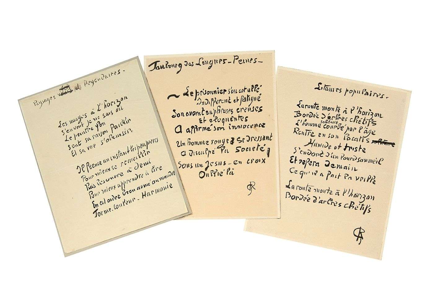 3 POÈMES autographes, dont deux signés du monogramme «GR», calligraphiés au pinceau à l'encre de Chine sur papier | 1 page in-8 chaque contrecollée sur carton.