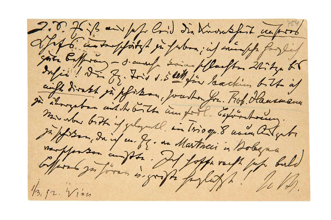 L.A.S. «J. Br.», [Vienne 1er mars 1892], à son éditeur Fritz SIMROCK à Berlin | 1 page oblong in-12, adresse au dos (Correspondenz-Karte).