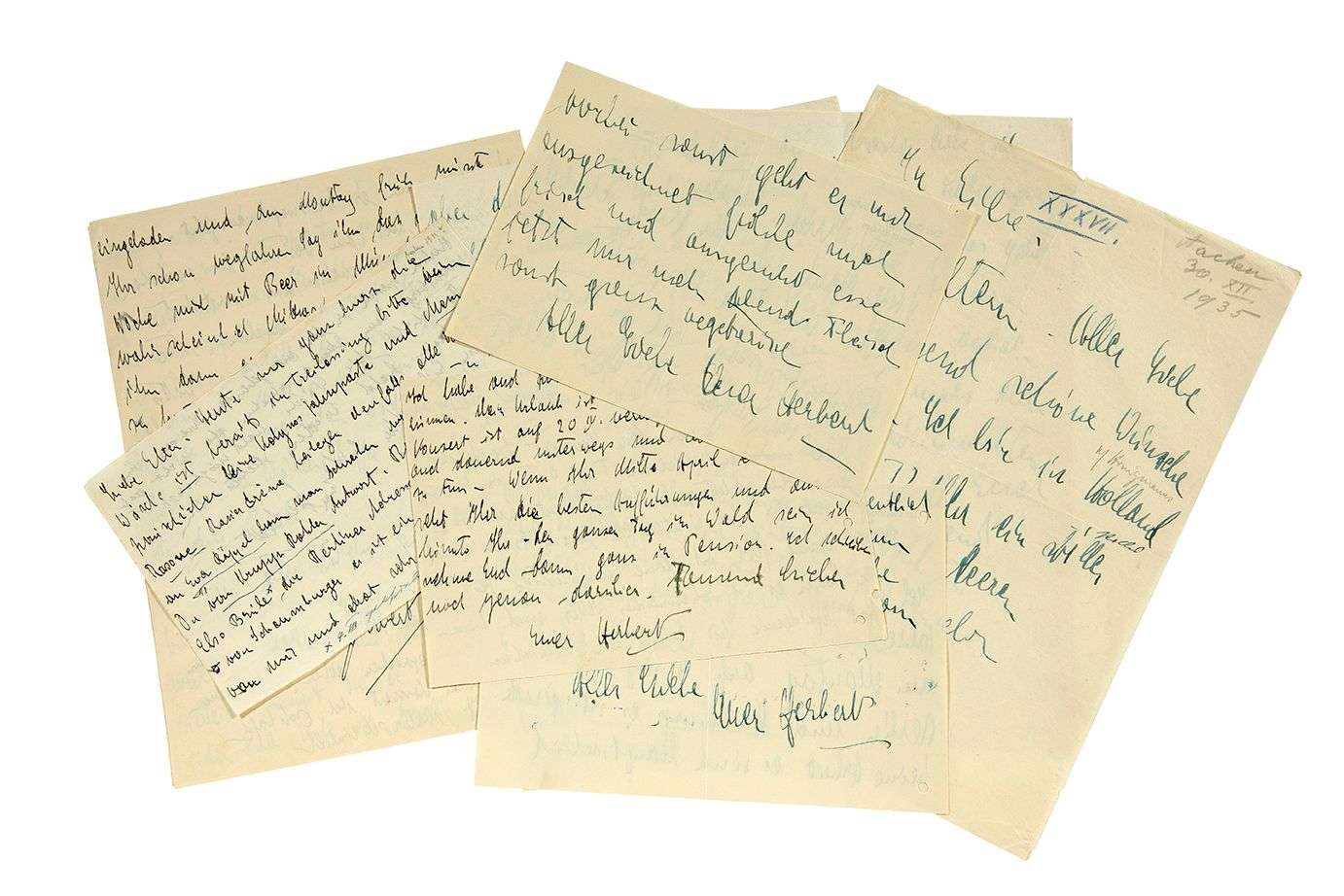7 L.A.S. «Herbert», Aachen 1935-1936, à ses parents | 19 pages in-4 ou oblong in-8, 4 à en-tête Der Generalmusikdirektor der Stadt Aachen | en allemand (trous de classeur à qqs lettres).