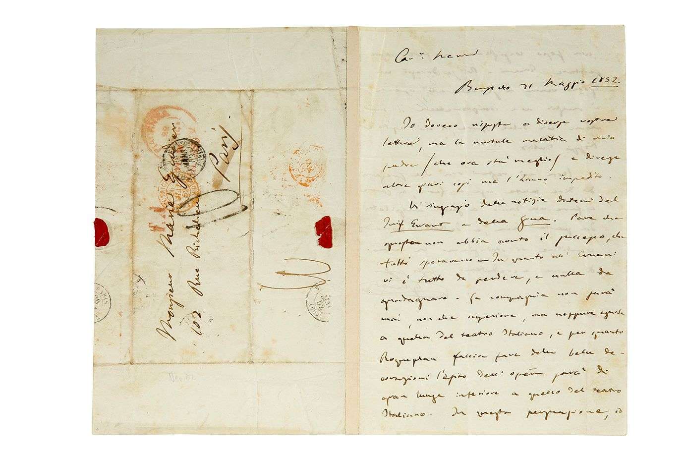 L.A.S. «G. Verdi», Busseto 21 mai 1852, à M. Marie ESCUDIER à Paris | 2 pages in-8, adresse avec cachets postaux | en italien.