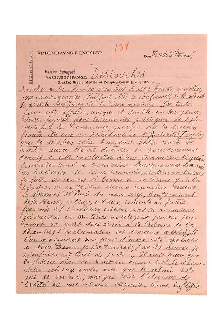 L.A.S. «Destouches» et «Louis», [Prison de Copenhague] Mardi 28 août 1946, à son avocat danois Thorvald MIKKELSEN et à SA FEMME Lucette DESTOUCHES | 2 pages in-4 à l'encre sur papier rose à en-tête de la prison Københavns Fængsler, Vestre Foengsel.
