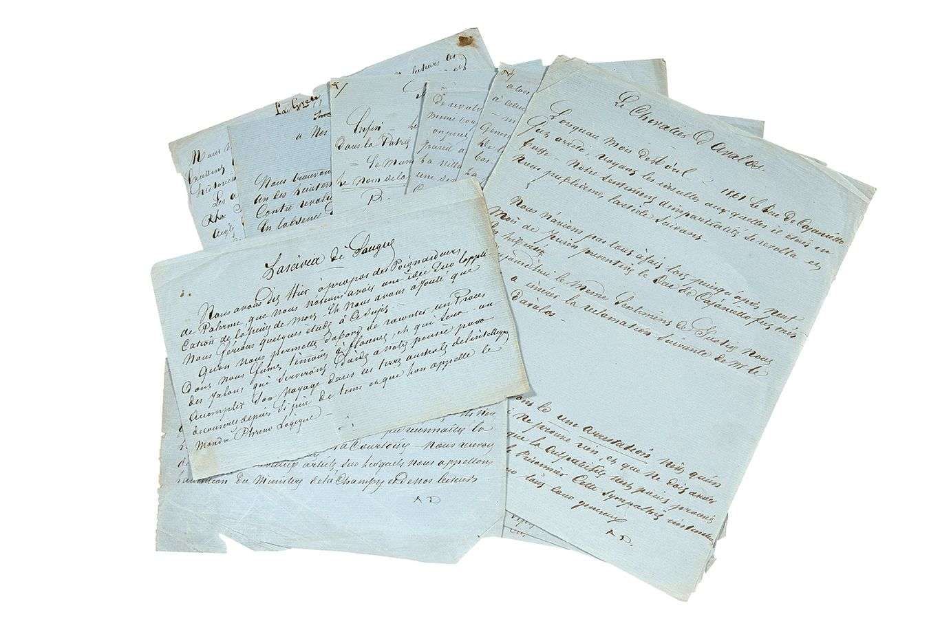 4 manuscrits autographes (ou fragments), dont 3 signés «A.D», [vers 1860-1862] | 2pages in-8 et 7 pages in-4 sur papier bleu.