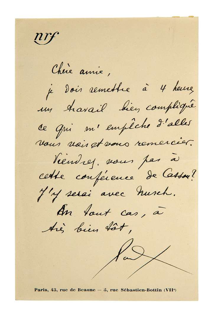 L.A.S. «Paul» à un amie | 1 page in-8 à en-tête de la nrf.
