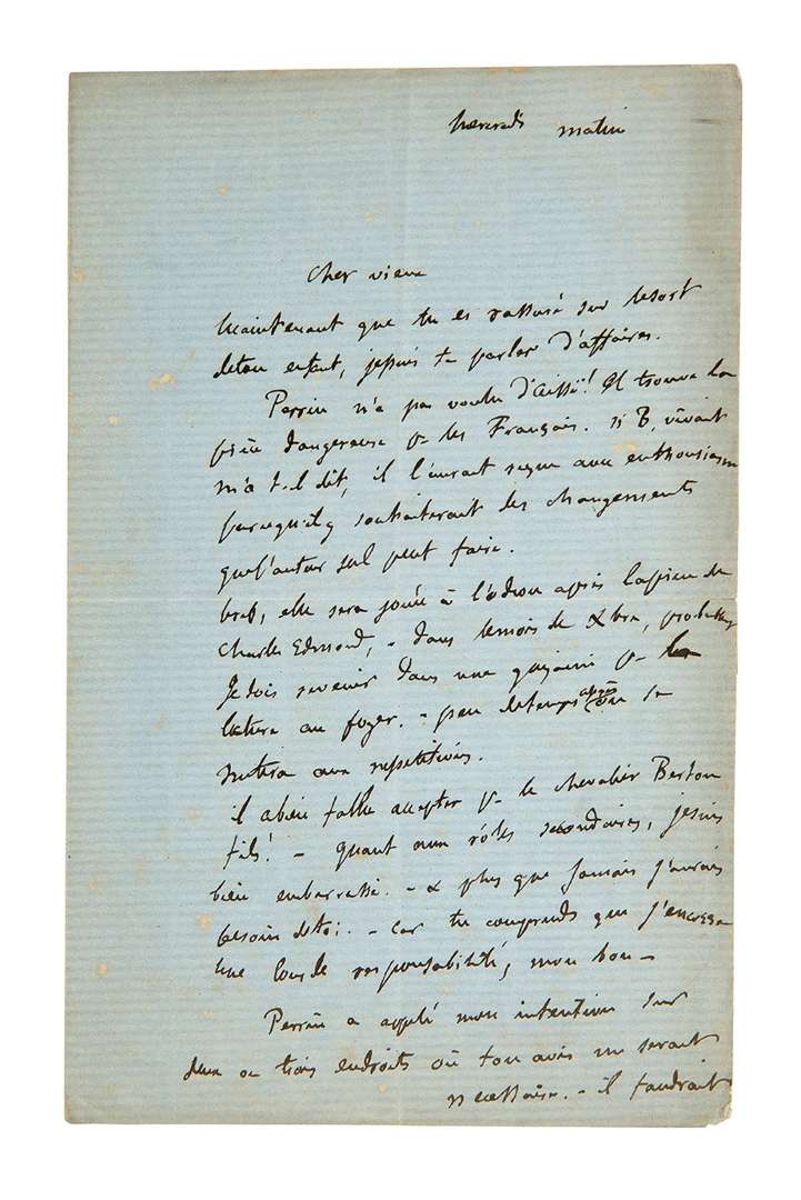 À propos de Mademoiselle Aïssé, pièce de Louis BOUILHET [qui sera créée en janvier 1872]. ...«Perrin n'a pas voulu d'Aïssé ! Il trouve la pièce dangereuse pour les Français. Si B. vivait m'a dit-il, il l'aurait reçue avec enthousiasme parce qu'il y souhaiterait des changements que l'auteur seul peut faire. Bref, elle sera jouée à l'Odéon après la pièce de Charles-Edmond - dans le mois de décembre probablement»... Pour la distribution, «il a bien fallu accepter pour le chevalier Berton fils ! - Quant aux rôles secondaires, je suis bien embarrassé - & plus que jamais j'aurais besoin de toi»... Flaubert voudrait avoir l'avis de son ami sur deux ou trois points de la pièce : «il s'agit de coupures importantes, ces MM. de l'Odéon vont en faire d'absurdes. - Je suis bien embêté». Il va apporter Le Sexe faible [autre pièce de Bouilhet qui ne sera jamais représentée] à Perrin | il presse d'Osmoy de venir à Croisset afin qu'ils puissent causer tranquillement, et s'exclame : «Ils veulent me donner Mlle Colombier pour Mme de Tencin ! [...] Je suis sûr qu'ils vont vouloir faire des économies sur la mise en scène. Ton autorité serait prépondérante. Tout le monde dit que tu vas devenir Ministre des Beaux-Arts. Beaucoup même le croient (sic)»... [Le comte d'Osmoy, collaborateur de Bouilhet et Flaubert sur Le Château des Coeurs, a été élu député en février 1871].