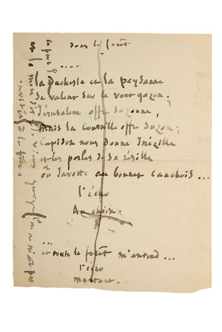 Premier jet, barré d'un trait vertical, de la première strophe de cette chanson à deux voix qui sera recueillie dans l'oeuvre posthume, Toute la Lyre (VII, 23, xiii) : «La duchesse et la paysanne