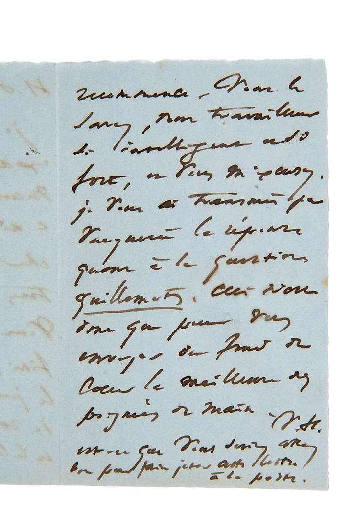 L.A.S. «V.H.», H[auteville] H[ouse] 25 février [1866], au Docteur Émile ALLIX | 2 pages in-12, enveloppe. «Je ne suis pas exact à répondre, mais je suis fidèle à aimer mes amis. [...] tous les jours je veux vous écrire, et le travail fini, il se trouve que le jour aussi est fini. Je remets au lendemain, et le lendemain le labeur recommence. Vous le savez, vous travailleur si intelligent et si fort, et vous m'excusez». Il lui a transmis par Vacquerie «la réponse quant à la question guillemets»...