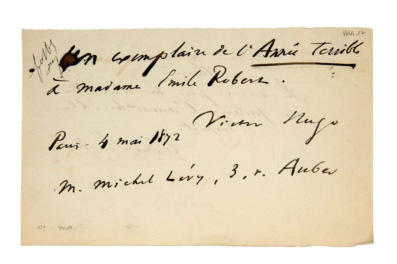 Billet destiné à l'éditeur Michel LÉVY : «Un exemplaire de l'Année Terrible à Madame Émile Robert».