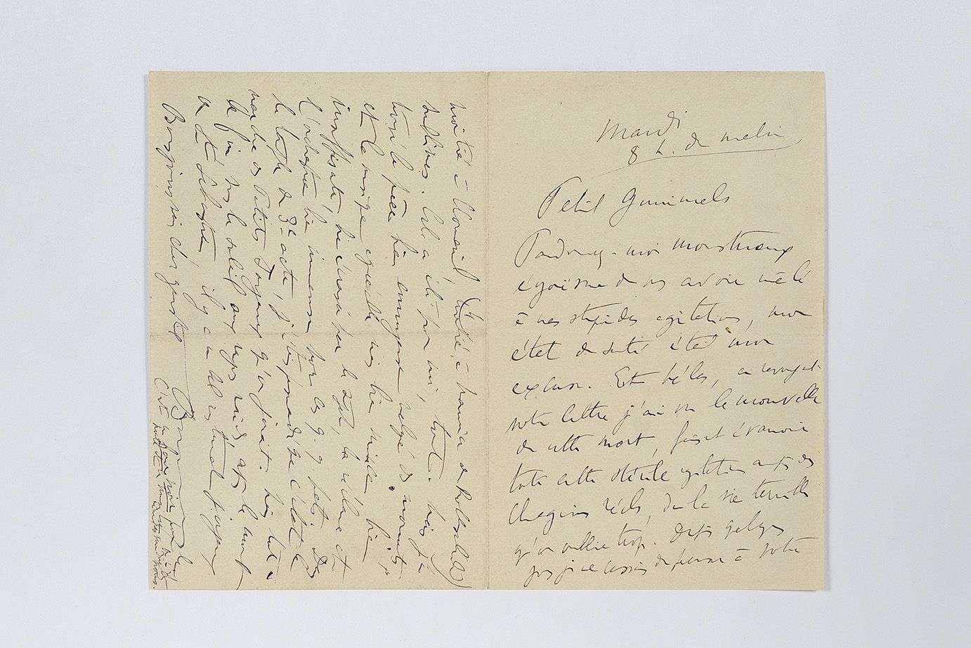 Saint Sébastien de Gabriele D'ANNUNZIO, musique de Claude DEBUSSY, dansé par Ida RUBINSTEIN.] « Petit Gunimels, Pardonnez-moi monstrueux égoïsme de vous avoir mêlé à mes stupides agitations, mon état de santé était mon excuse. Et hélas, en revoyant votre lettre j'ai vu la nouvelle de cette mort [Leni Falk, née Seligman, nièce de Reynaldo Hahn, morte le 22 mai], faisant évanouir toute cette stérile agitation auprès des chagrins réels, de la vie terrible qu'on oublie trop. Depuis quelques jours je ne cessais de penser à votre pauvre petit neveu [Édouard Seligman, frère de Leni, mort en 1907] le sourd muet, à qui je pense souvent, dont je rêve souvent, un des seuls êtres pour qui je ne puisse pas croire que l'existence est finie et qu'il n'a pas ailleurs une compensation à son incomplète vie. [...]