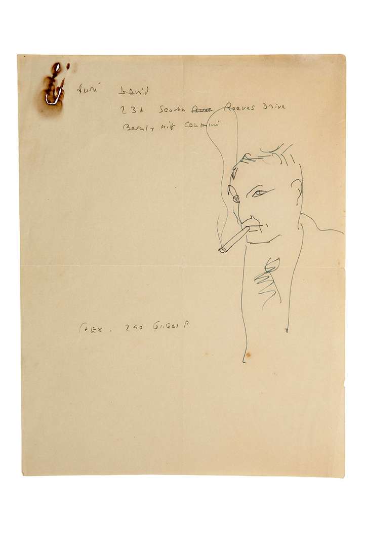 En tête de la feuille, Saint-Ex a noté l'adresse d'André David à Beverly Hills. Le portrait est peut-être celui d'André David. [André DAVID (1899-1988), écrivain et journaliste, avait fondé les «Conférences des Ambassadeurs» pour faire rayonner la culture française. Au début de la 2e Guerre mondiale, il put se réfugier aux États-Unis où il dirigea l'Institut Français fondé à Hollywood par Charles Boyer.]