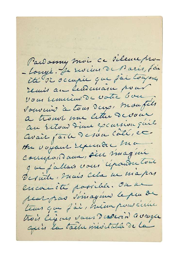 Elle prie d'excuser son silence : «Je reviens de Paris, j'ai été si occupée que j'ai toujours remis au lendemain pour vous remercier de votre bon souvenir à tous deux [...] On ne peut pas s'imaginer le peu de tems que j'ai, même pour écrire trois lignes sans devenir aveugle après la tâche inévitable de la journée. Cela me rend bien maussade, contre mon intention et contre mon caractère qui se laisserait aller si volontiers aux doux loisirs et aux relations sympathiques. Croyez que j'apprécie mieux que je ne sais l'exprimer et que je ne peux le prouver, celle qui s'est formée entre nous, et que je vous désire tout le succès et toutes les satisfactions dues à votre talent. J'espère que vous travaillez avec plaisir et courage. C'est un grand élément, je ne dirai pas de bonheur, mais de rassérénement dans les choses de la vie. Tout ce qui est le côté matériel, la publication, le parti à tirer du travail, voilà la chose odieuse et le nid aux déceptions, mais les heures où l'esprit crée sont douces, et si les artistes n'étaient pas forcés de les payer par des contrariétés immenses, ils seraient mieux partagés qu'il n'est permis de l'être en ce monde»...