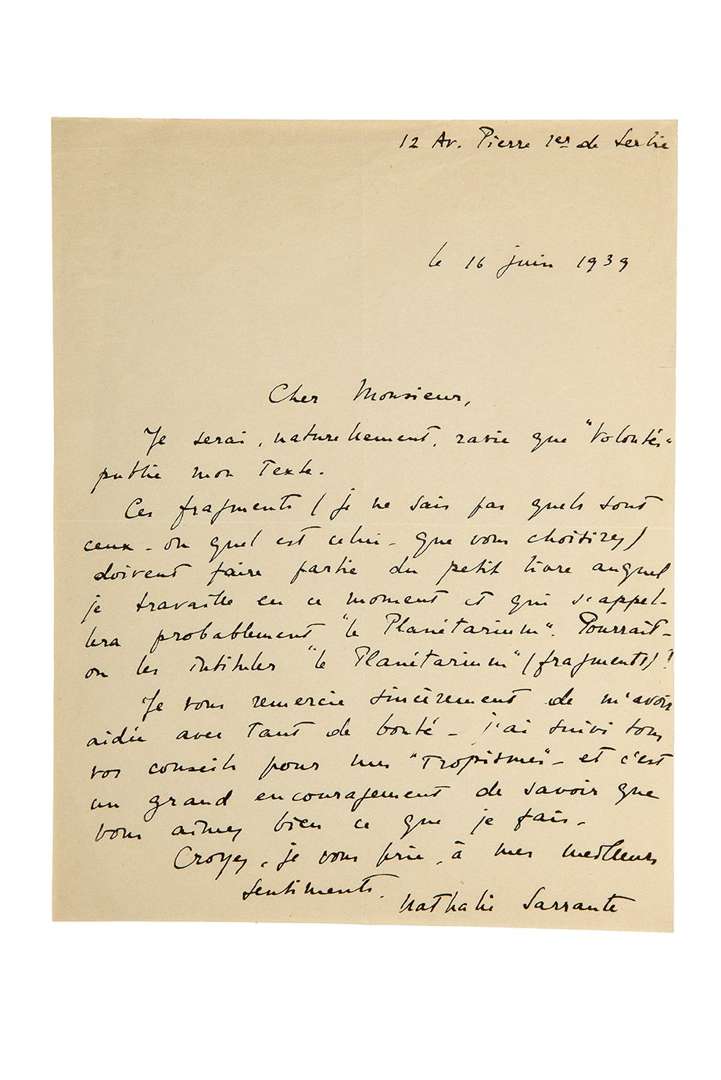Elle serait ravie que la revue Volontés publie son texte. Ces fragments «doivent faire partie du petit livre auquel je travaille en ce moment et qui s'appellera probablement Le Planétarium. [...] Je vous remercie sincèrement de m'avoir aidée avec tant de bonté. J'ai suivi tous vos conseils pour mes Tropismes - et c'est un grand encouragement de savoir que vous aimez bien ce que je fais»...