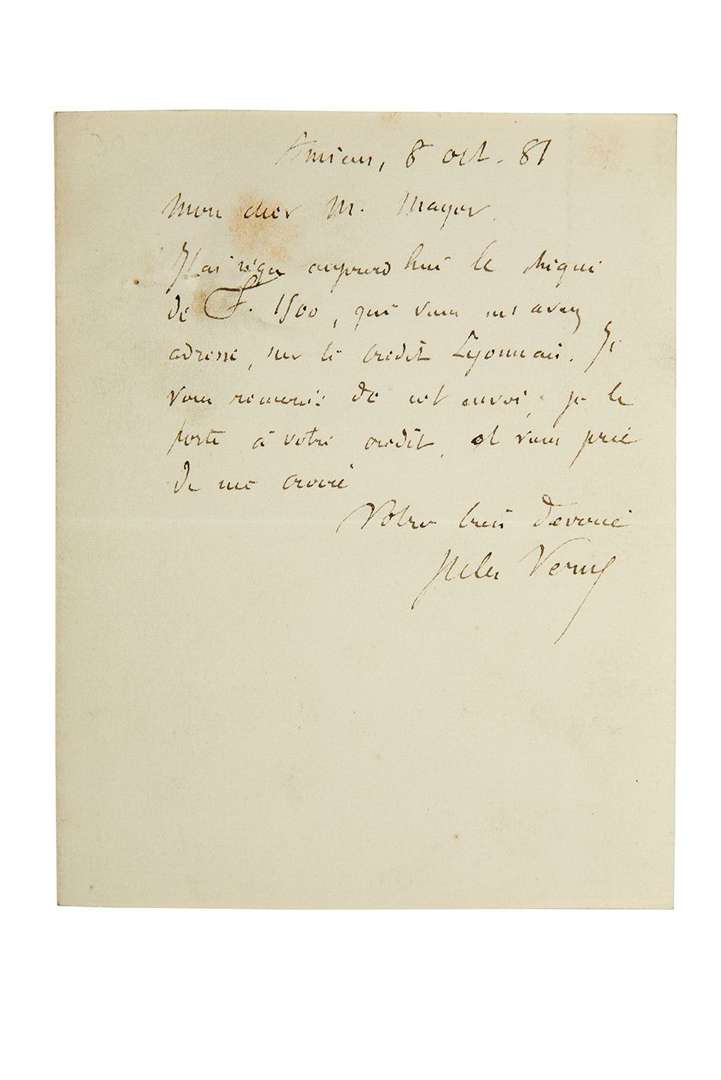 L.A.S. «Jules Verne», Amiens 8 octobre 1881, à M. Mayer | demi-page in-12.